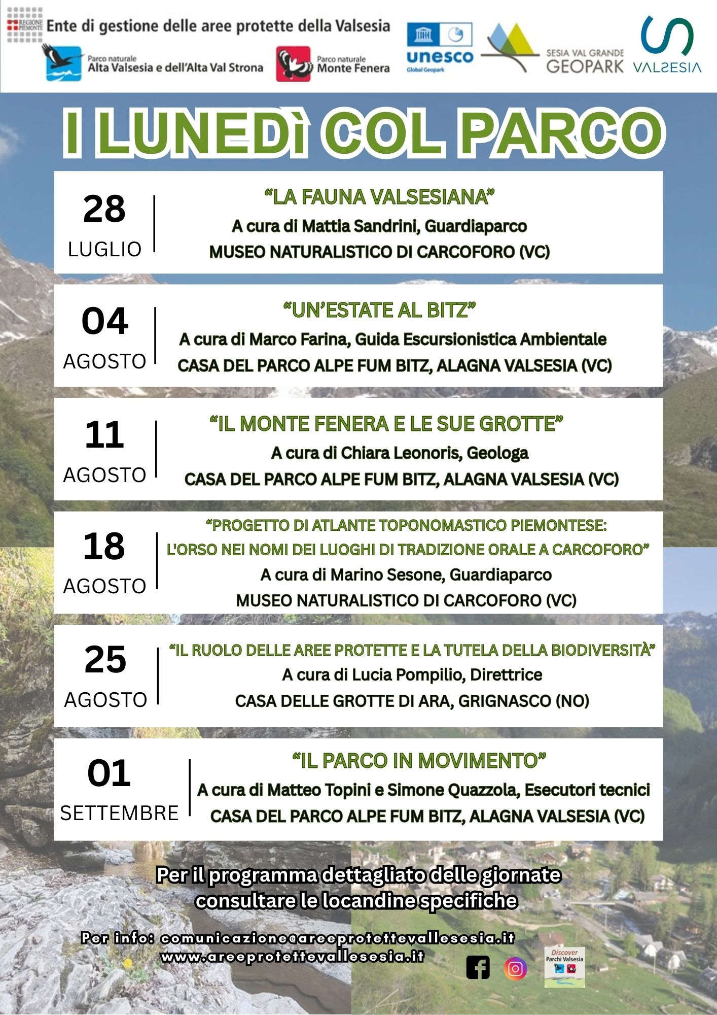 L’Ente di gestione delle Aree protette della Valsesia – che dal 2012 tutela e valorizza il Parco Naturale Alta Valsesia e Alta Valstrona e il Parco Naturale del Monte Fenera – organizza sei giornate, ciascuna articolata in due incontri (uno al mattino e uno al pomeriggio), per far scoprire le meraviglie delle Aree Protette.