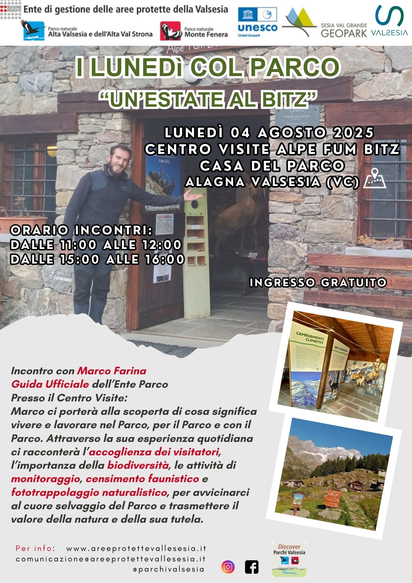 Casa del Parco Alpe Fum Bitz, Alagna Valsesia (VC) Orario incontri: dalle 11:00 alle 12:00 e dalle 15:00 alle 16:00