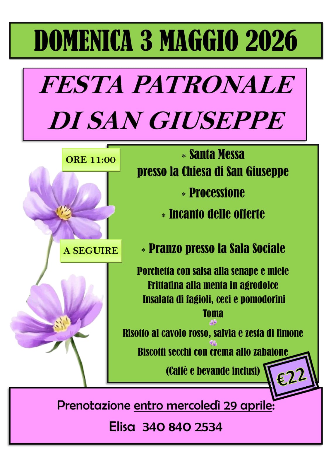 Per prenotazioni (entro il 29 aprile p.v.): Elisa 340 840 2534