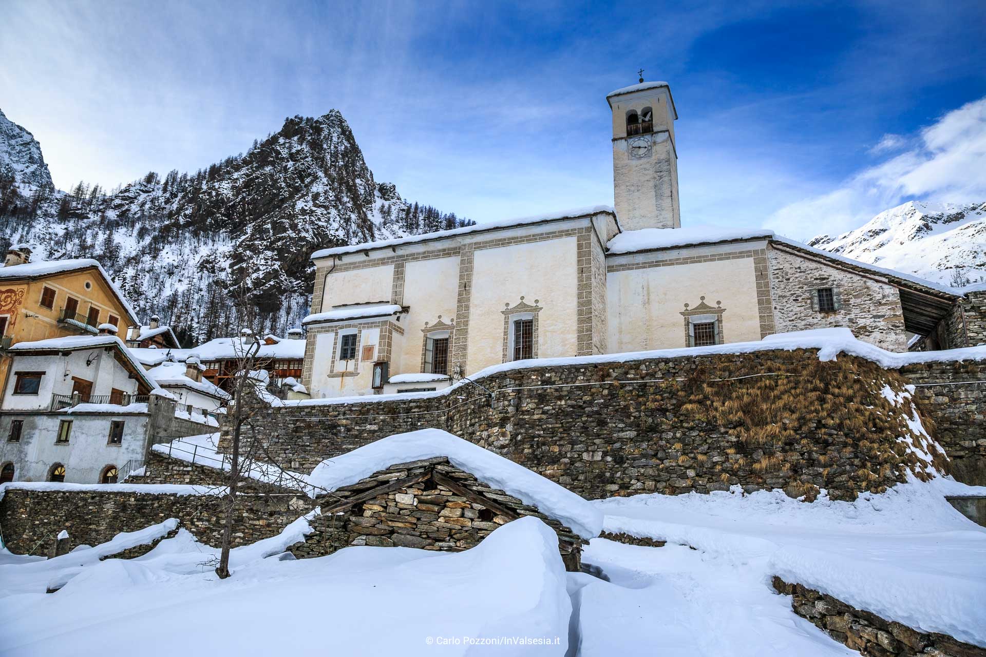 La chiesa parrocchiale di Rima si trova proprio al centro nella piazzetta del villaggio.