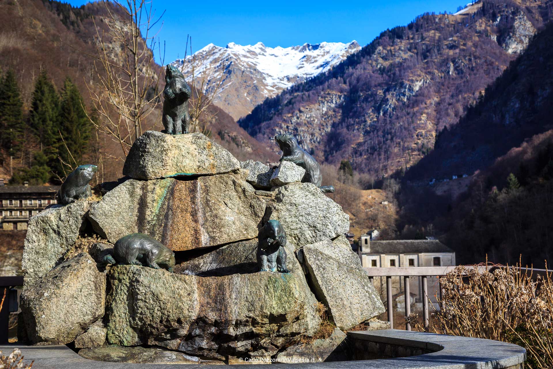 Monumento alle marmotte nella piazza all'ingresso della Località Rimasco